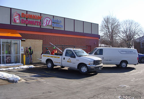We were glad to hear no one was injured when we arrived at this accident site. A morning customer had driven thru the front of the building taking out the window and sales area. Crosstown coordinated and completed cleanup and repairs with City approved inspections by 3:30pm. The owner was able to open his business in time for afternoon rush. |